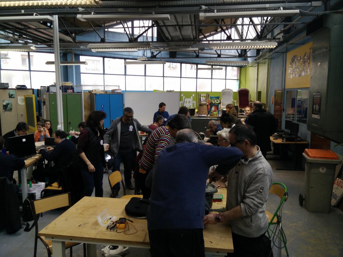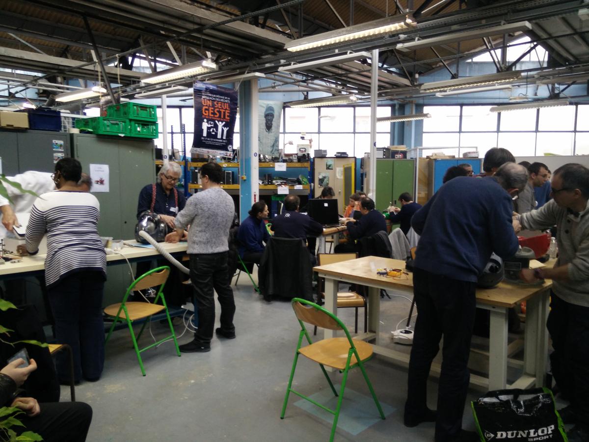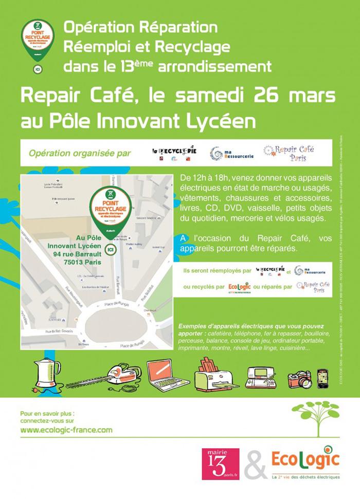 L’association Repair café Paris organisait également ce jour-là dans le lycée un Repair café qui a connu un grand succès. Les Repair cafés (ou cafés réparation) ont pour objectif d’aider les particuliers à réparer leur matériel pour lutter contre l’obsolescence programmée. Chaque personne qui voulait faire réparer un appareil devait prendre un numéro, par ordre d’arrivée, puis attendre qu’un bénévole de l’association Repair café Paris soit disponible pour l’aider.